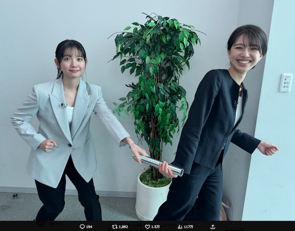 田中瞳アナ(左)とバトンタッチセレモニーも/「モヤさま」公式X(@moya2_official)から