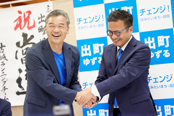高岡市長選で当選した出町譲さん(右)と/(提供写真)