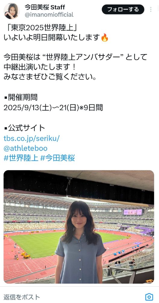前髪が魅力的な世界陸上の今田美桜(本人のスタッフのXから)