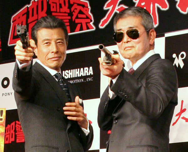 「西部警察」「大都会」シリーズDVD化合同記者発表での舘ひろし(左)と渡哲也(C)日刊ゲンダイ