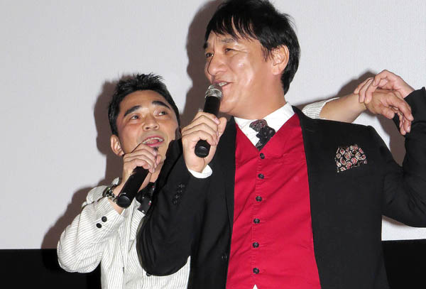 映画「DENKI GROOVE THE MOVIE?」で舞台挨拶するピエール瀧(右)と盟友の石野卓球/(C)日刊ゲンダイ