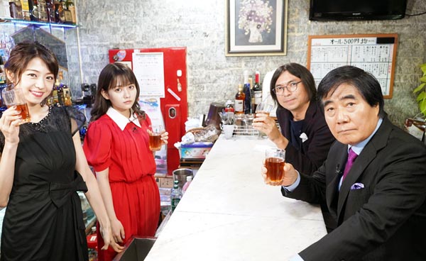 BSチャンネル12「スナック胸キュン1000% ママこの人つれて来た!」に出演する村西とおるAV監督(=右、左から中村静香とノアちゃん・右奥はふかわりょう)/(提供写真)