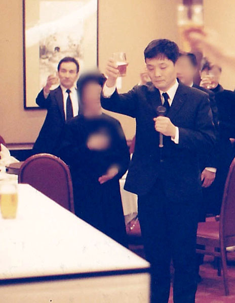 父・良一氏の葬儀で献杯の音頭を取る吉次氏(左端がジャニー氏=1993年)/(本人提供)
