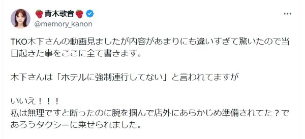 元女子アナ青木歌音がTKO木下と「ホテルに連行」事件を巡り対立も…もう一人の"性加害"芸人もヒント拡散で戦々恐々
