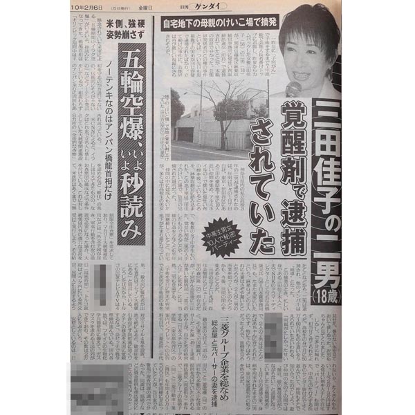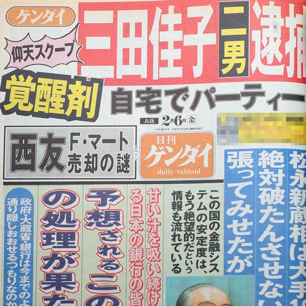 「三田佳子の二男 覚醒剤で逮捕されていた」(1998年2月6日付け紙面)/(C)日刊ゲンダイ