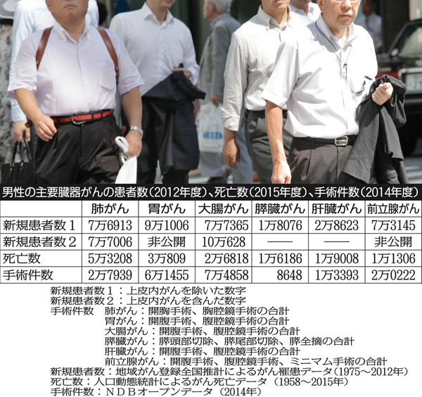 男性主要臓器がんの患者数(12年度)、死亡数(15年度)、手術件数(14年度)/(C)日刊ゲンダイ