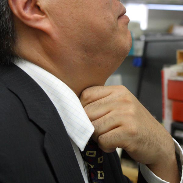 【喉の腫れ】イスに姿勢よく座り下顎を前に突き出し首を伸ばす