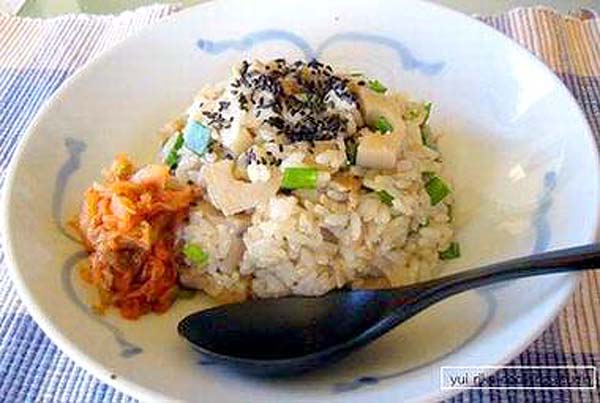 キムチを添えてゴマをふりかける「レンコンの炊き込みご飯」(提供写真)