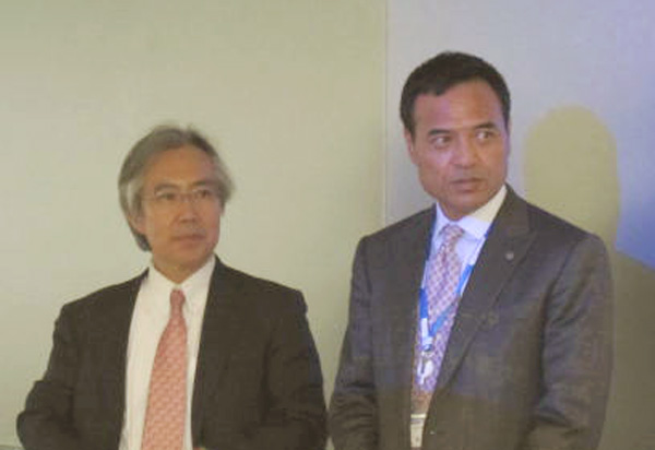 サントリーHDの新浪社長(右)と筆者(提供写真)
