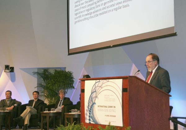 ゲノム編集の国際会議がまとめた声明を発表するカリフォルニア工科大のデービッド・ボルティモア教授(C)共同通信社