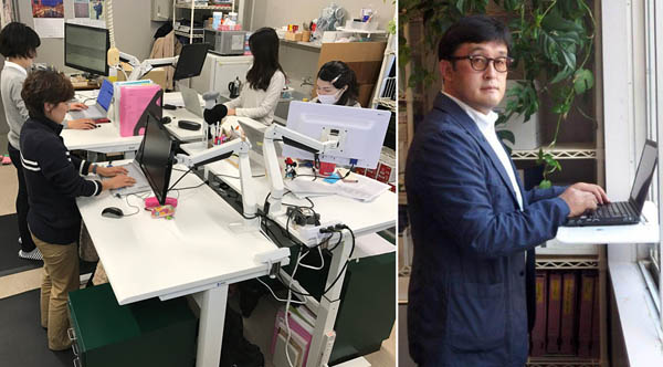 立って働くのがいい、右は岡浩一朗教授(提供写真)