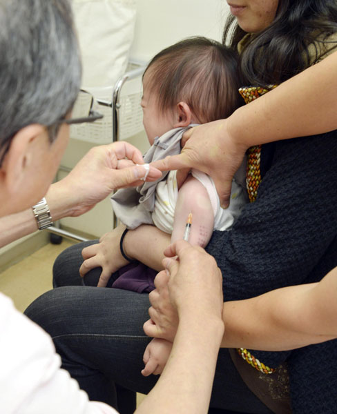 はしか、風疹混合ワクチンの接種を受ける1歳児(C)共同通信社