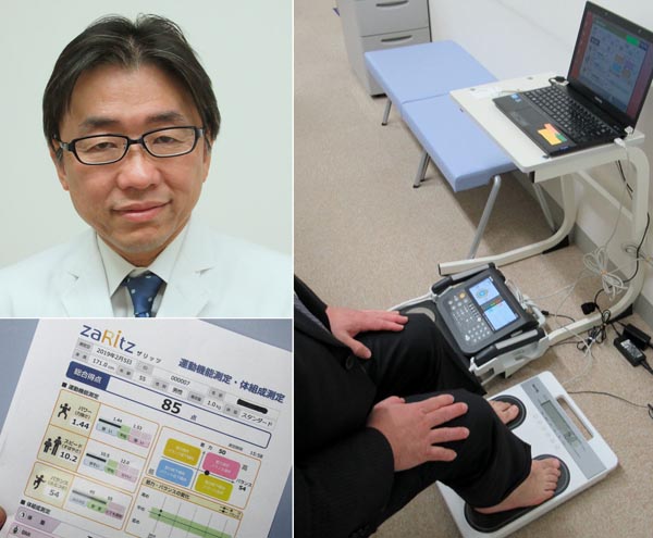 「ザリッツ」(右)は椅子に座った状態で立ち上がるだけで測定できる(左上が横山啓太郎教授)/(提供写真)