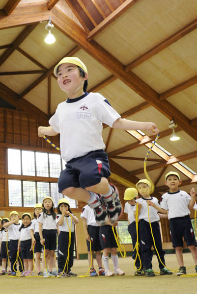 元気に縄跳びをする福島県郡山市の幼稚園児たち(C)共同通信社