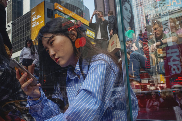 NYのマジソン・スクエア・ガーデンでスマホを見る女性(C)ロイター