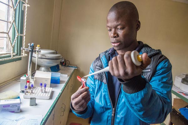 アフリカはまだま深刻な状況が続く(採血した血液を検査機器にかける準備をするスタッフ)/(C)共同通信社