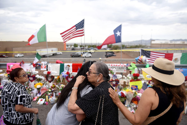 テキサス州エルパソで起きた銃乱射事件の現場に花をたむける人々(C)ロイター