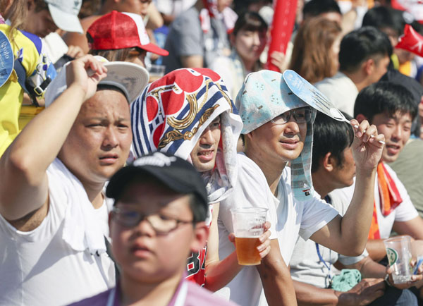 強烈な日差しの中でも夏の甲子園では熱心な観戦客が(C)共同通信社