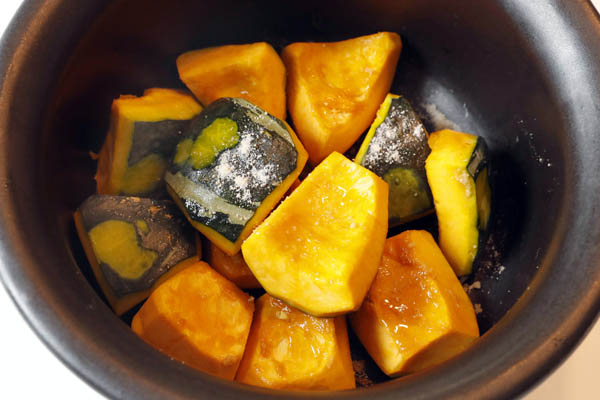 砂糖の脱水作用でカボチャの自然な甘味を引き出す