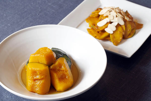 カボチャの含め煮(手前)とピリ辛炒め(C)日刊ゲンダイ