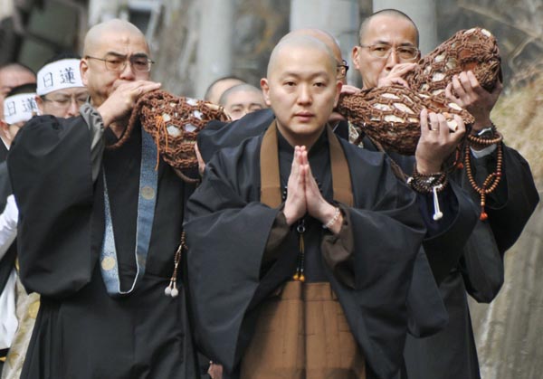 東日本大震災の犠牲者を悼み、念仏を唱えながら練り歩く僧侶(C)共同通信社