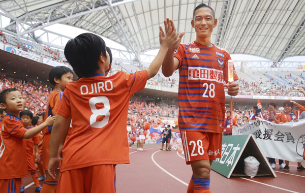 10月5日、白血病からの復帰戦で、子どもたちとタッチを交わすサッカーJ2新潟の早川史哉(C)共同通信社