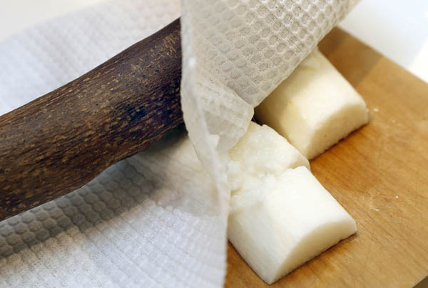 ペーパータオルをかぶせて上からすりこぎで叩く(C)日刊ゲンダイ