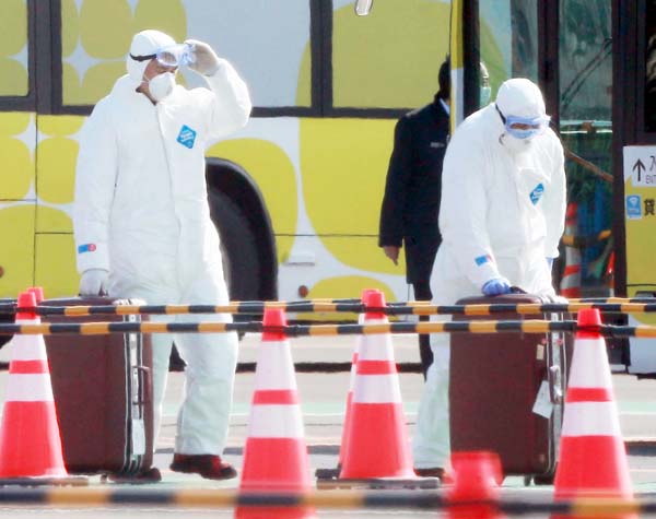 ダイヤモンド・プリンセス号の周辺で作業する関係者(C)日刊ゲンダイ