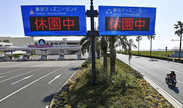 新型コロナウイルス感染拡大の影響で、東京ディズニーランドと東京ディズニーシーの休園を知らせる電光掲示板(C)共同通信社