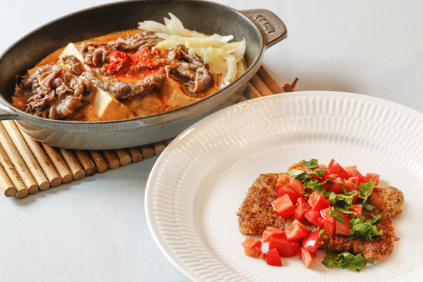 牛肉のミラノ風カツレツ(手前)と肉豆腐(C)日刊ゲンダイ