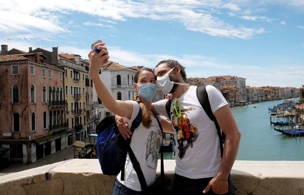 ヴェネチアの観光地で写真を撮るマスク姿の観光客(C)ロイター