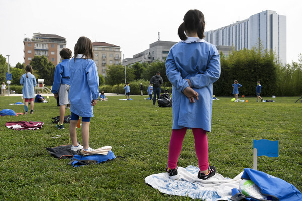 屋外で間隔を空けて授業を受ける子どもたち(C)LaPresse/共同通信イメージズ