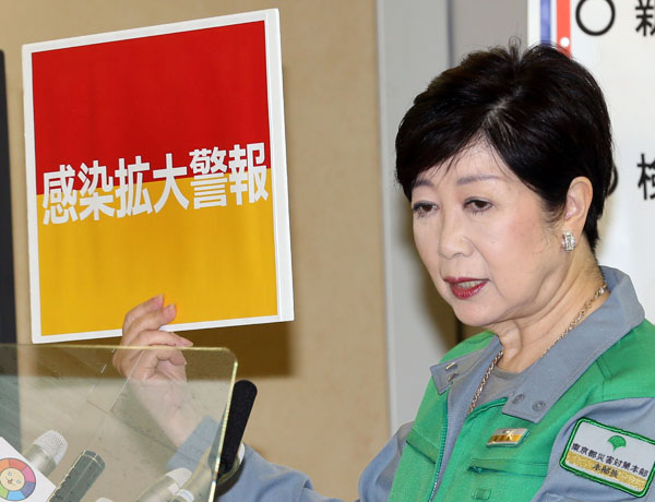「感染拡大警報」のフリップを掲げる小池都知事(C)日刊ゲンダイ