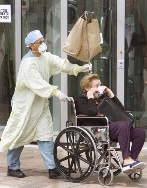 2003年、カナダでSARSが流行し273人が感染した(退院するSARS高齢患者を、彼女の車まで付き添う防護服の病院従業員)/(C)ロイター