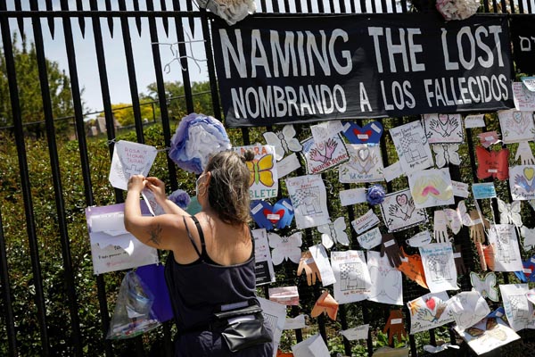 墓地の前で新型コロナに感染し亡くなった犠牲者の名前を記す女性(C)ロイター=共同