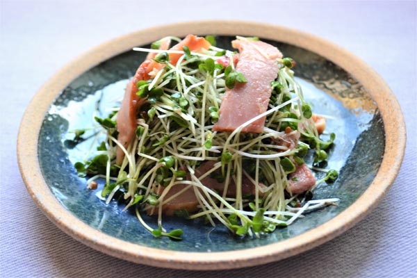 焼き豚とブロッコリースプラウトの梅ごま風味(提供写真)