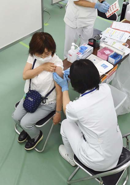 大規模接種会場でワクチン接種を受ける女性(代表撮影)