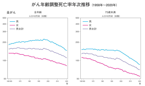 がん年齢調整死亡率年次推移(1958年~2020年)「がんの統計 2022」(がん研究振興財団)