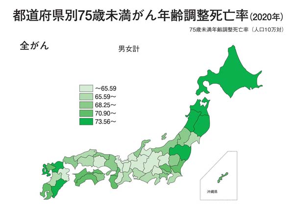 都道府県別75歳未満がん年齢調整死亡率(2020年)「がんの統計 2022」(がん研究振興財団)