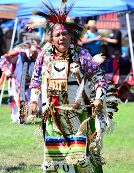 祝賀の日に伝統的な衣装を着て踊るネイティブアメリカンの男性(C)John Collett/ZUMA Press Wire/共同通信イメージズ