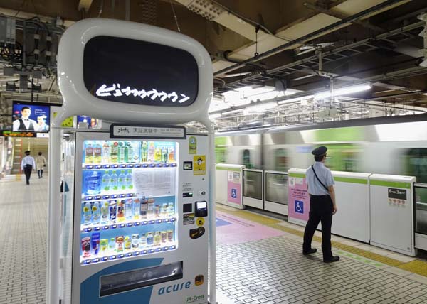耳が不自由な乗客向けの新サービスの実証実験で、JR上野駅ホームの飲料自動販売機上部に設置された「エキマトペ」のディスプレー(C)共同通信社