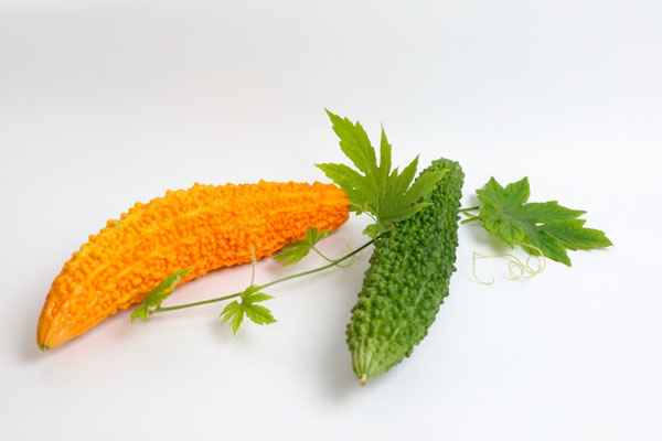 オレンジ色に熟したゴーヤー(左)は意外にも甘く、おいしい