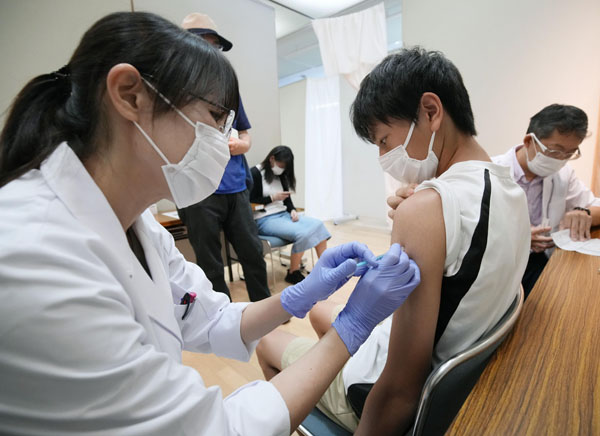 新型コロナのワクチン接種を受ける男子(C)共同通信社