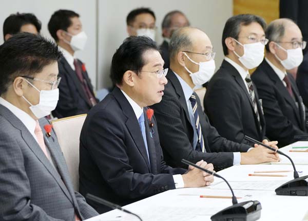 同時流行対策の検討会議に出席する岸田首相(左から2人目)/(C)共同通信社