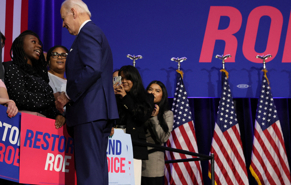 中絶の権利に関する発言を行った際、後ろのステージに立っている人たちに挨拶するバイデン大統領(C)ロイター