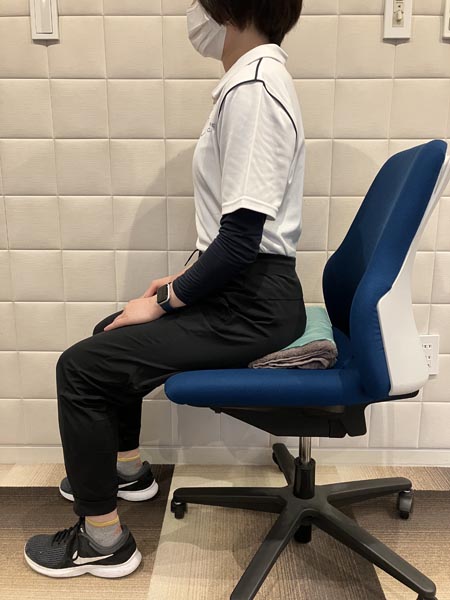 タオルをお尻の後ろ半分に挟んで浅く座る(提供写真)