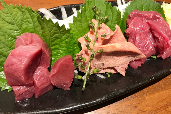 兜の形の鍋で馬肉をしゃぶしゃぶ、焼き焼き、ジューッと揚げる