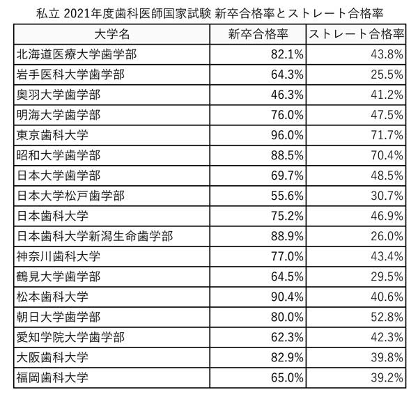 (表2)私大 2021年歯科医師国家試験 新卒合格率とストレート合格率
