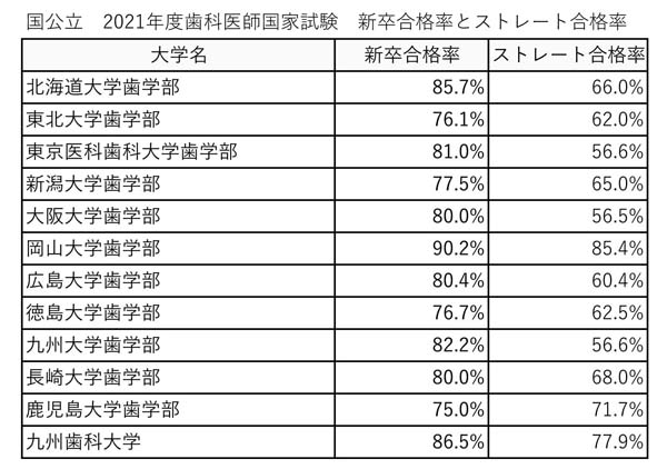 (表1)国公立 2021年歯科医師国家試験 新卒合格率とストレート合格率