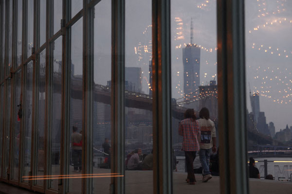 カナダの山火事によるもやと煙に覆われたマンハッタンのスカイラインを背景に歩く人々(C)ロイター